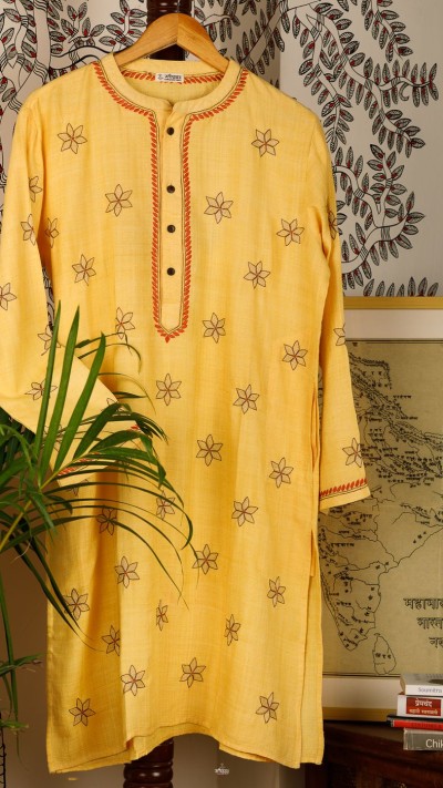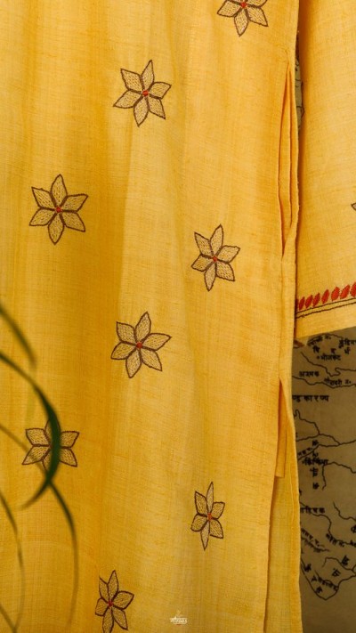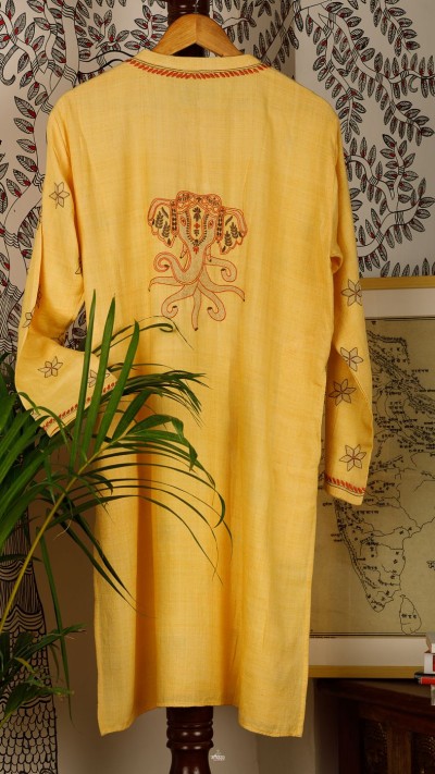 The base of this stunning Yellow Kurta is handwoven Eri/Ahimsa/Peace Silk, with work done in shades of Rust & Dark Chocolate.