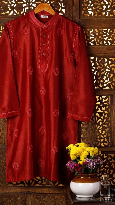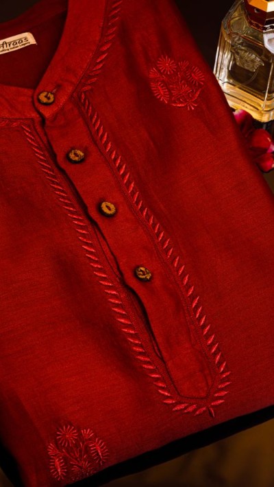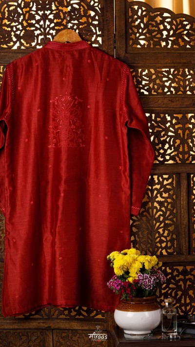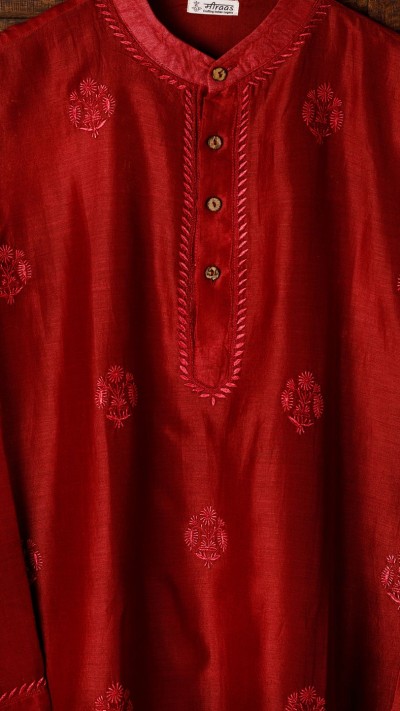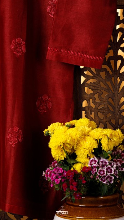 An Oxblood shade Chikankari Kurta in our Noir series of exploring rich, dark shades. The Kurta is a classic in our Noir moodboard! It also amalgamates our Amer motif.
