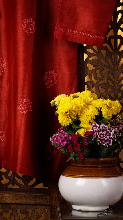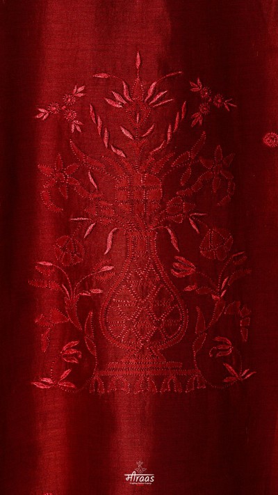 This rich Oxblood shade kurta has a beautiful ghaspatti bel neckline. It features an antique late 19th Century miniature flower vase motif, which also finds its parallel in Amer fort. This is why we picked this motif to go along with the grand Amer motif newly crafted by us.