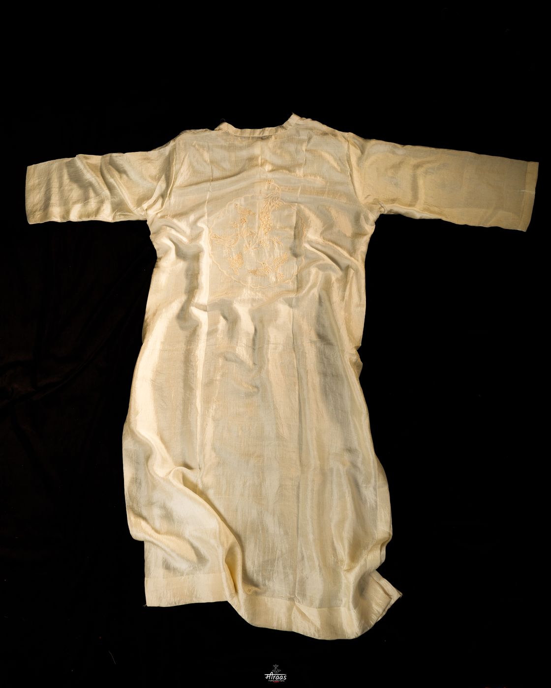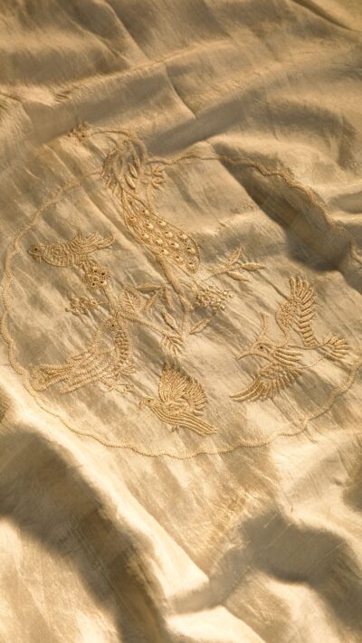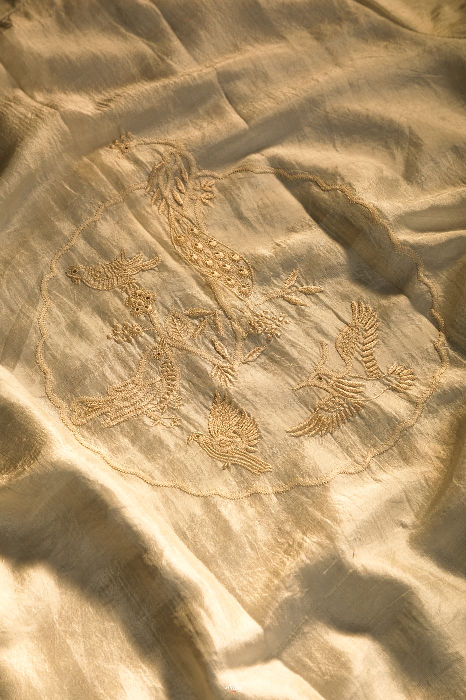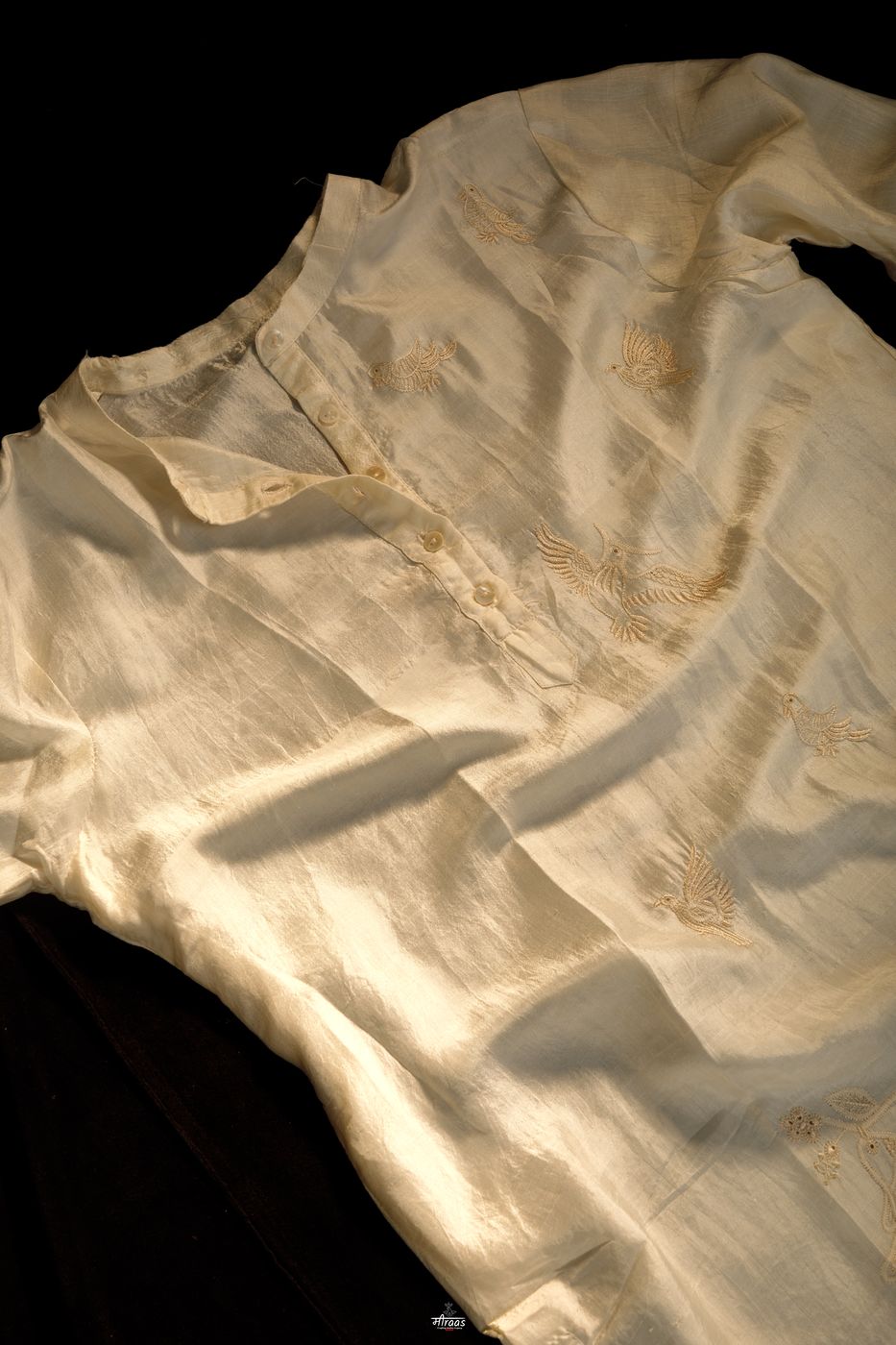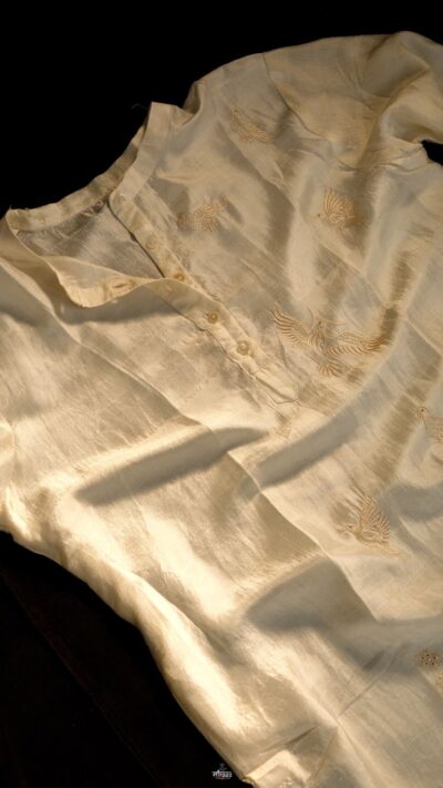 This ivory mulberry silk kurta, is embroidered with a flight of a collective of birds, namely, Sparrow, Doves, Kingfisher, Partridge, in a whimsical flight pattern on the front panel of the kurta in stately golden beige colour.