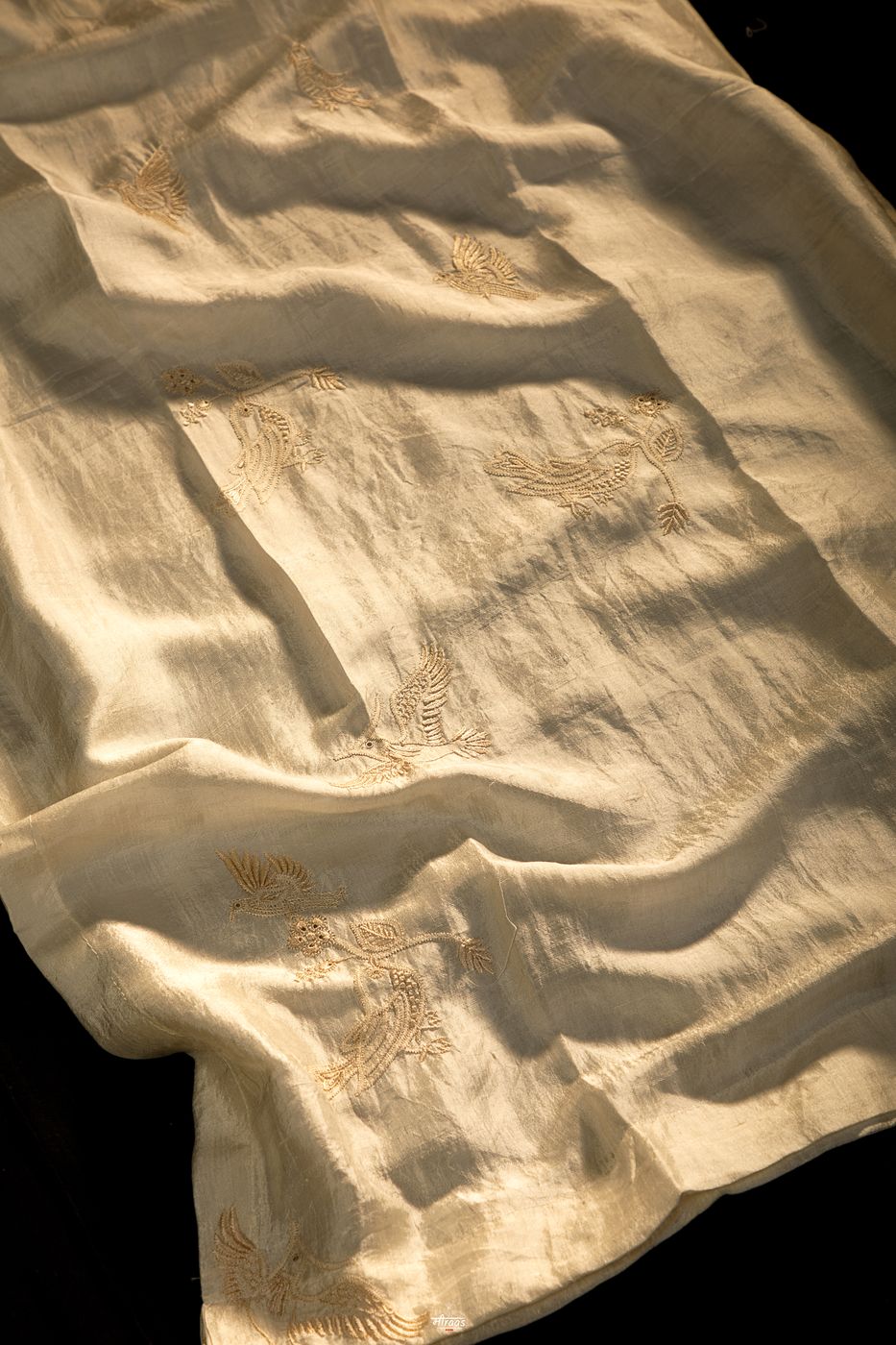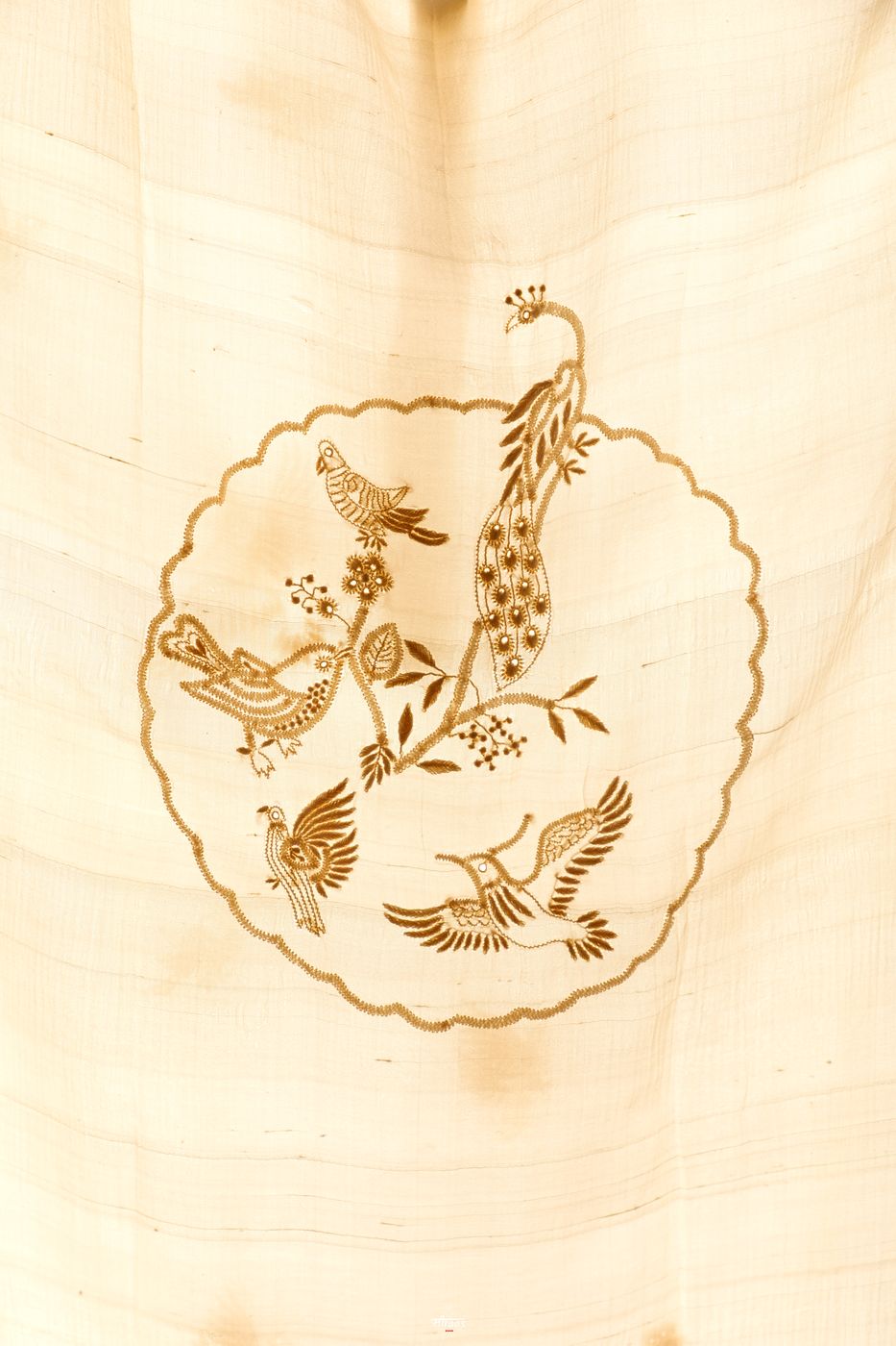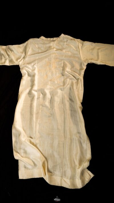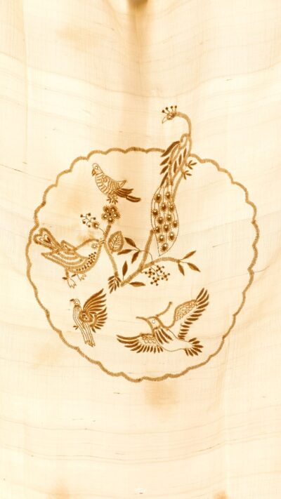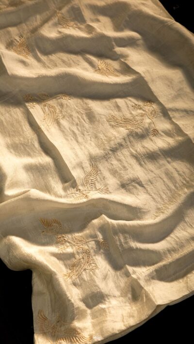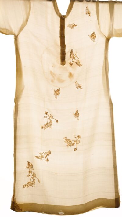 This ivory mulberry silk kurta, is embroidered with a flight of a collective of birds, namely, Sparrow, Doves, Kingfisher, Partridge, in a whimsical flight pattern on the front panel of the kurta in stately golden beige colour.