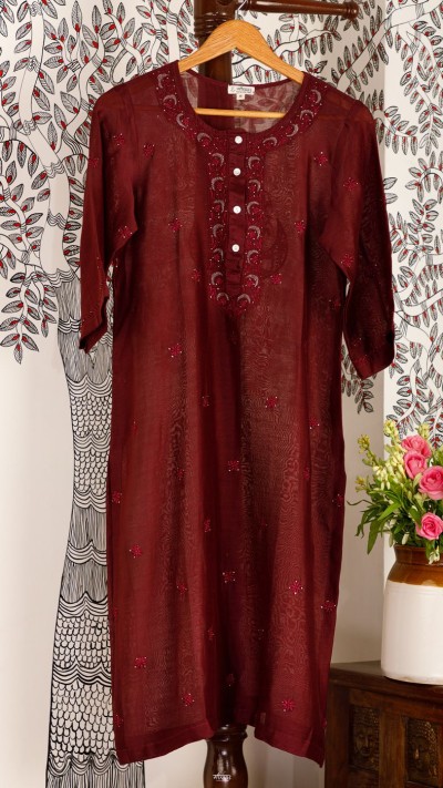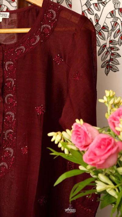 Noir is a series we had created a couple of years back, to celebrate a new dimension in Chikankari embroidery – the tone on tone dark. We started this process with Black, & since then have tried Moss Green, and now moving to explore Oxblood shade. This kind of Chikankari is the opposite of classic & ethereal White on White or pastel Tone on Tone. This is rich, decadent, sultry, elegant, mysterious & yet, stately.