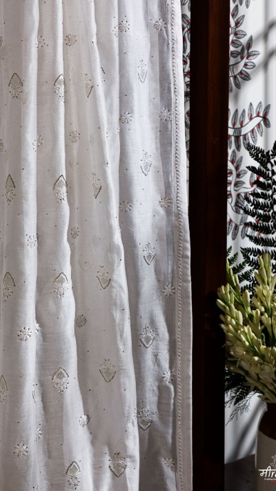 KHAYAL (moodboard): Champaai is a coloquial and beautiful colour name for White, and is commonly used in Lucknow’s language. Champaai is used to describe anything that is beautiful, soft & pristine white, like Champa flowers. This word has been often used to describe lovely feet of ladies or their glowing complexion, by the poets of Lucknow; on the other hand, it has also been used to describe the all White on White Chikankari attire worn by a lady of society, who further decorates herself with pearls and diamonds. Her clothes are then called “Champaai Joda” (all white ensemble). While it could be said “Safed Joda”, calling it Champaai makes it even more poetic, & shows appreciation for the styling done by the lady. This was the inspiration behind this soft jewel of a dupatta.