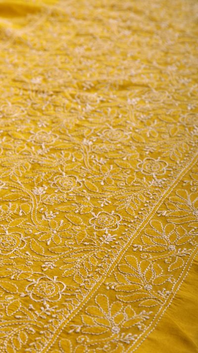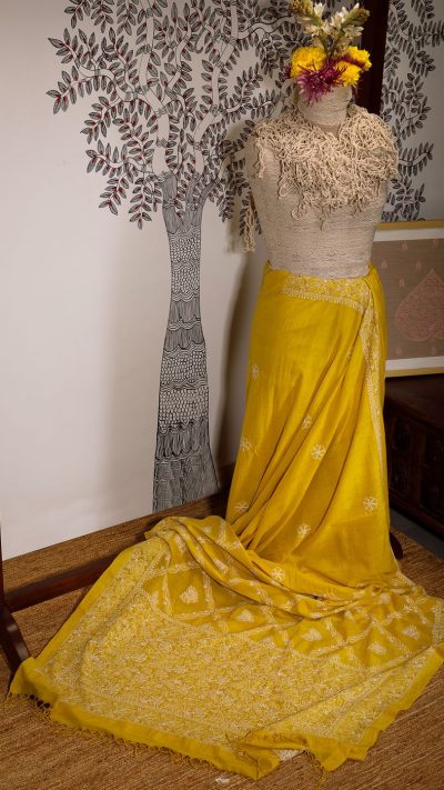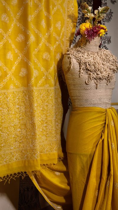Poshaak (about the saree): This lovely Sandalwood Yellow Chikankari saree has a very unique palla design, that features, Orma stitch along with shadow and phanda, with very intense and skilled designing.