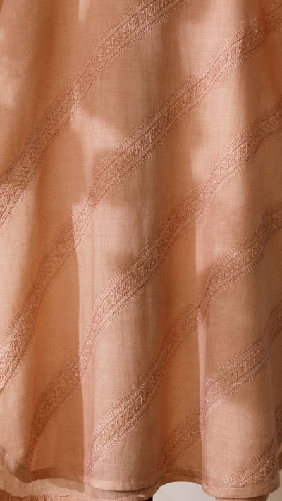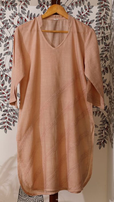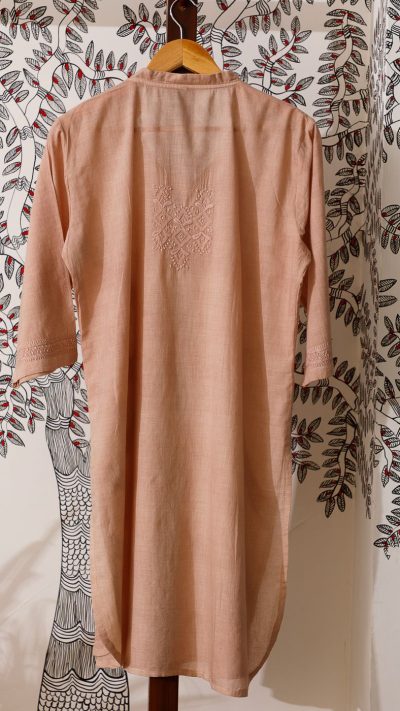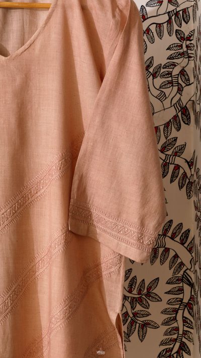 The slightly rounded hemline Kurta in Handloom Cotton has a unique design layout of diagonal stripes of a very traditional wall art mandana block. This strip is then embroidered with Orma and Murri, along with Phanda in very fine thread work, extensively. This work has also been done on the sleeves.