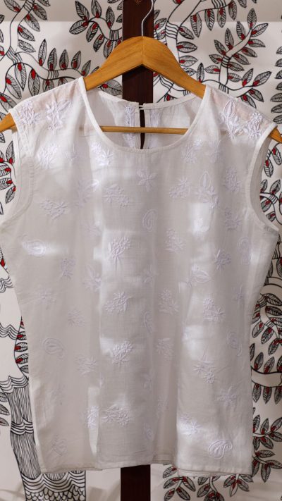 Reminiscent of the Summer Gardens of Awadh, this sleeveless Chikankari essential Top has been designed with a collective of very fine miniature motifs in a non form pattern all over the lovely Top. A summer essential.