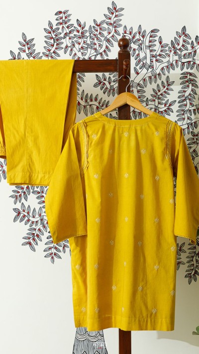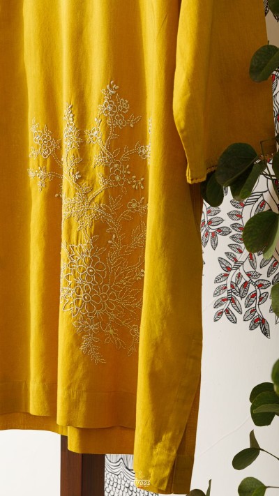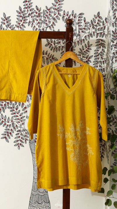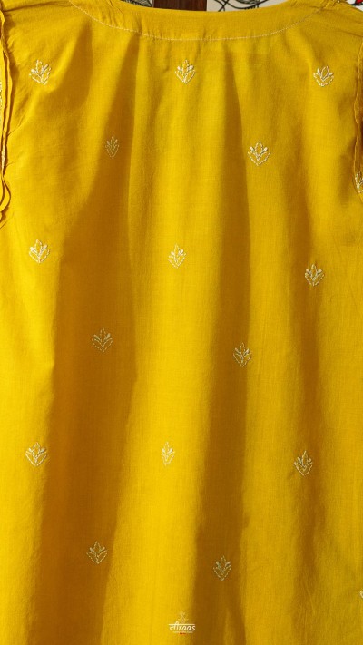 Dhaani is another favoured old hue of Lucknow city, after Gajari. In fact this city has always had its own unique shade chart & its own names. Green & Yellow was all good, but Dhaani was always an emotion. This beautiful & functional Co-Ord set in warm olive tones, has the Top or Kurti embroidered in the single statement Aamramanjari Motif, on the front, which displays very fine stitches of orma, shadow, ghaspatti, keel, phanda etc. The back & neckline has small floral shadow embroidery detailing.