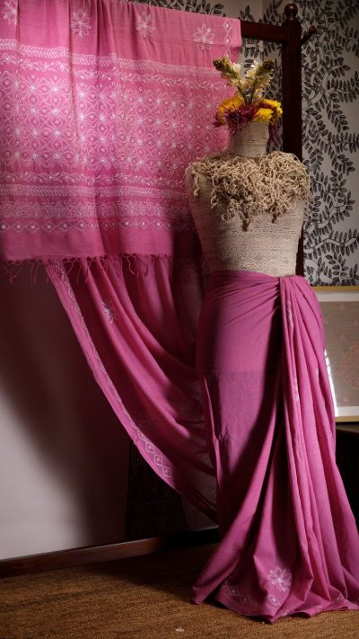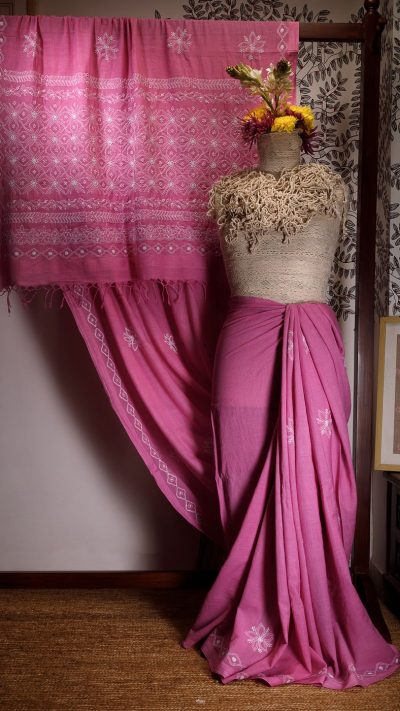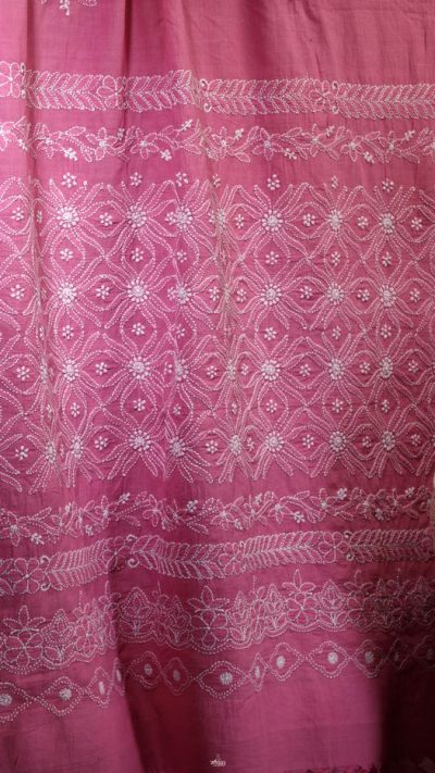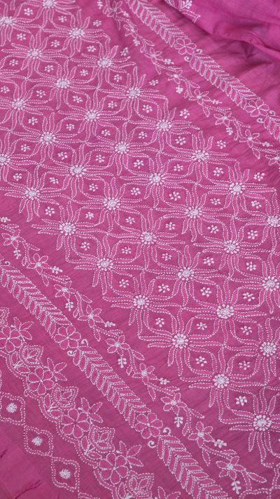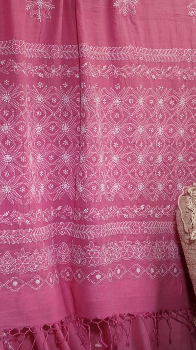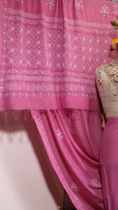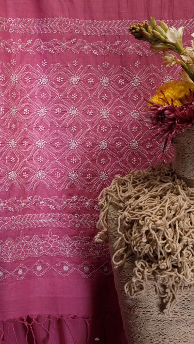 Poshaak (about the saree): This lovely Bakhiya (shadow) Phanda (French knot) embroidery Pink saree has a unique border display with multiple border usage on palla and a very fine border with keel kangan stitch, running through the saree.