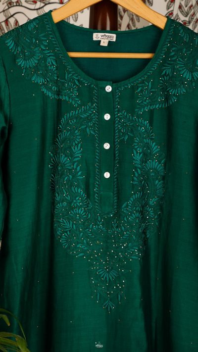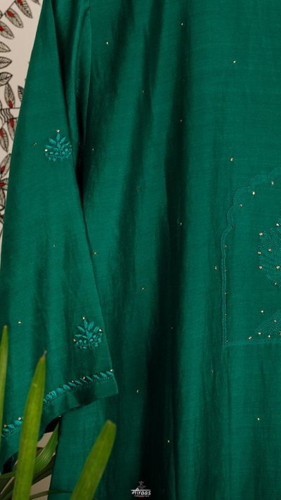 This beautiful Emerald Green Chikankari Kurta has a Kashmiri style heavy neckline of shadow & ghaspatti embroidery in tone on tone thread work. It also features a pair of Doves, flying towards the floral yoke, with subtle Mukaish highlights allover.