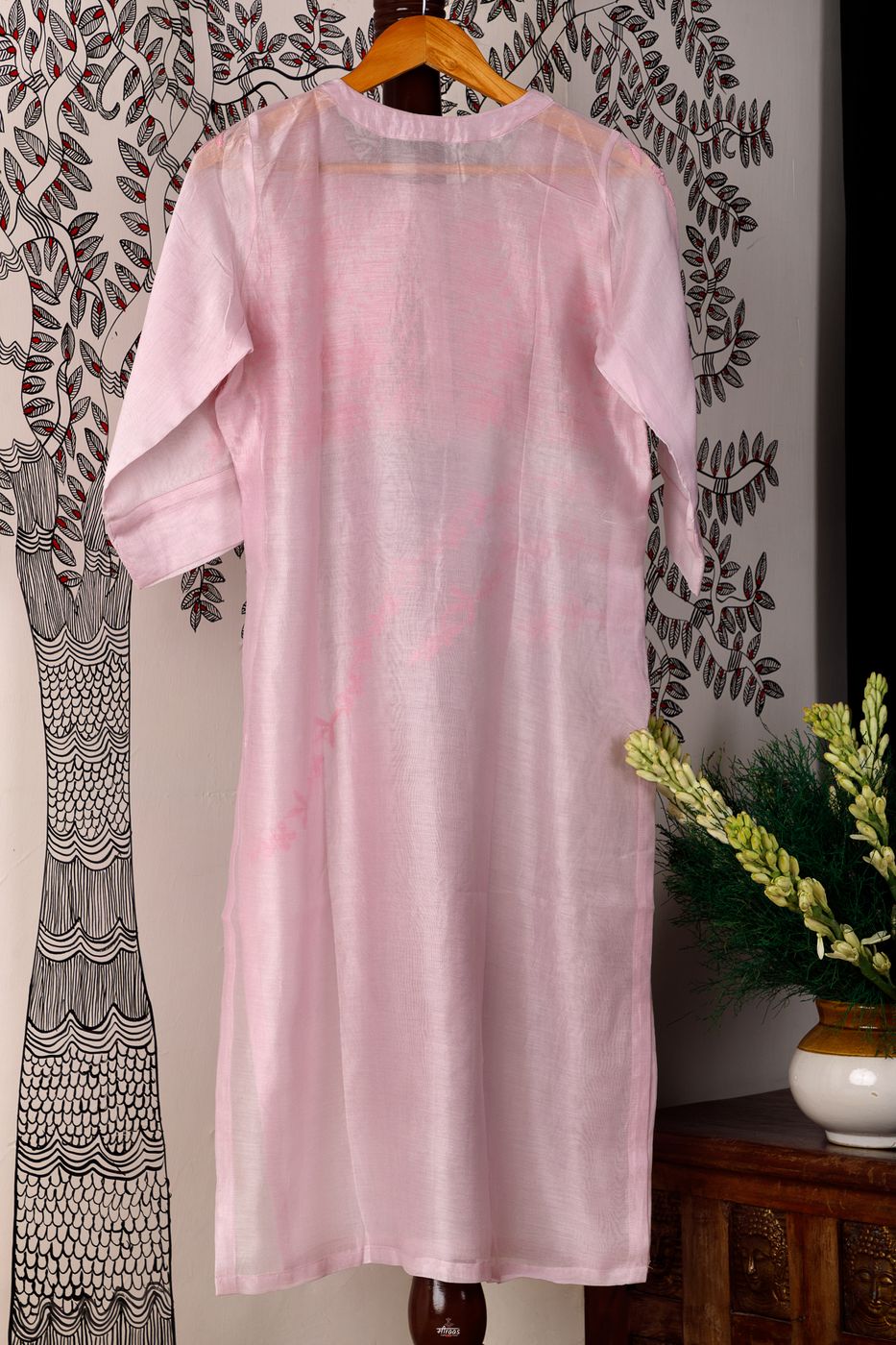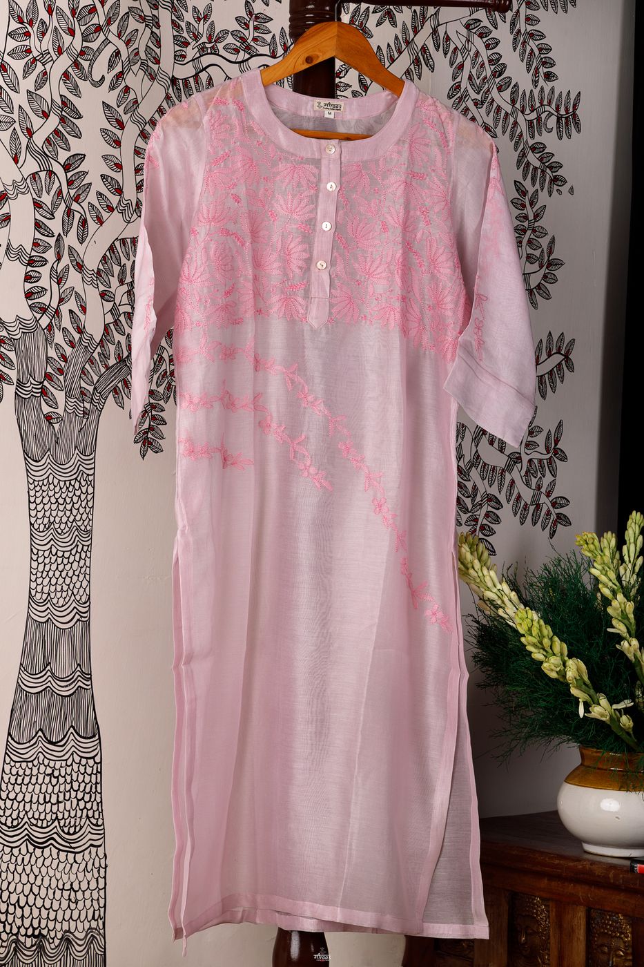 Kamalini Chanderi Kurta is a soft pink Handloom Chanderi Silk Kurta, embroidered with beautiful Lotus basque in shadow embroidery in a darker shade of Pink, creating the illusion of a blooming Lotus. The embroidery has lovely tendrils hanging out of the front and detailed on the sleeves beautifully, adding character to the overall design.