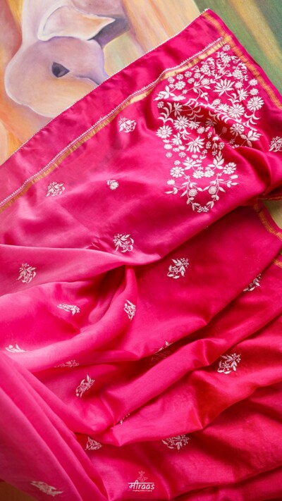 A gorgeous Chikankari saree with signature Floral motif of Kannauji Gulaab, in stunning Ombre shades of deeply fragrant roses of Kannauj. This saree is one piece only and Ready To Ship.