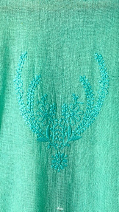 Beautiful and nuanced floral Chikankari motifs decorate the neckline and body with subtle hint of elegance. The back has a stunning bel boota. The super fine stitches used are – Ghaspatti, Bijli, Phanda, Pechni, most embossing stitches to help them stand out on Kala Cotton.