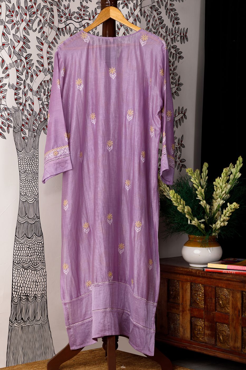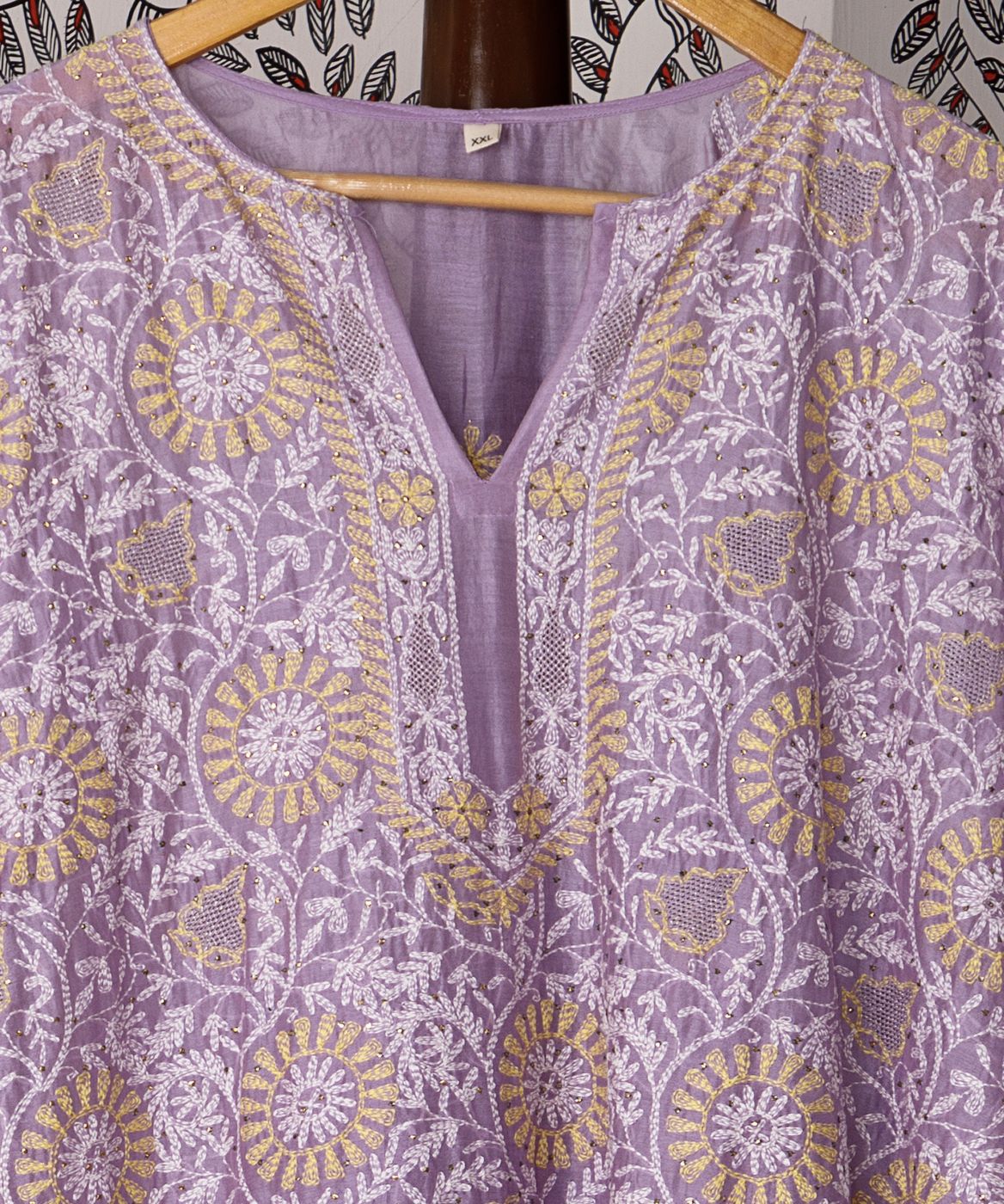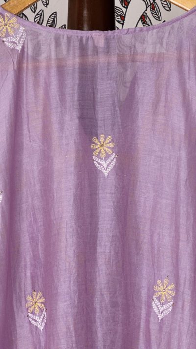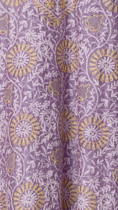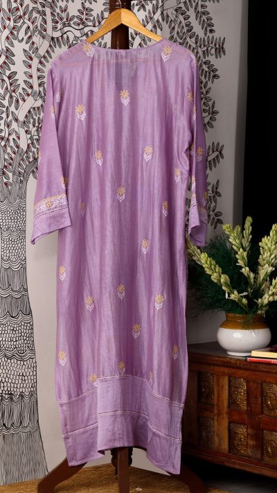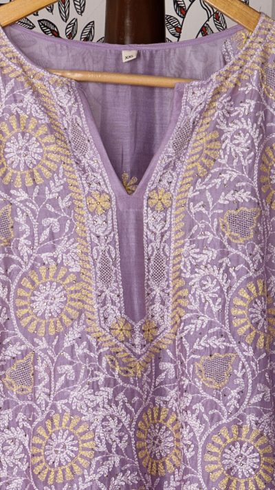 Gorgeous Lavender coloured Chikankari Kurta in Handloom Chanderi, with very interesting thread work of Lemon Yellow and White in very fine Tepchi stitch, along with Qasab Taar Jaali stitch. A very rare embroidery combination, that can be seen housed in National Crafts Museum.