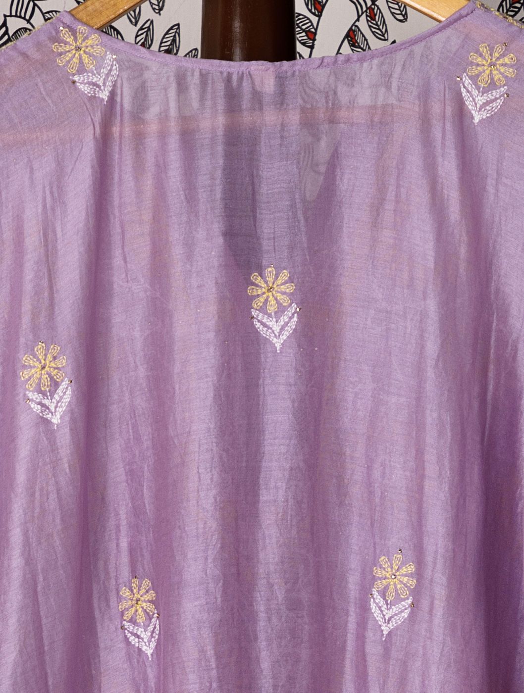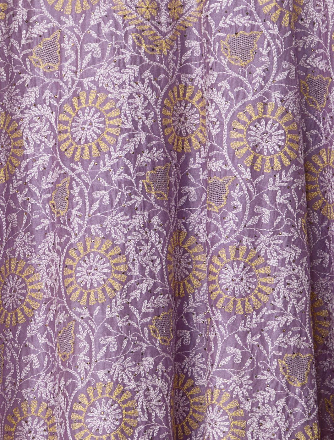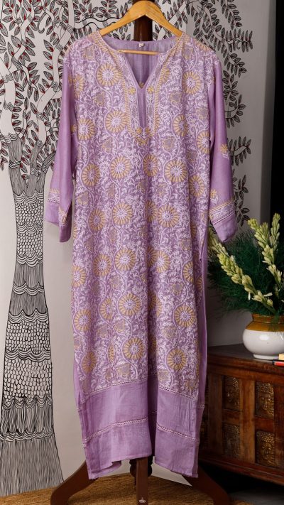 Gorgeous Lavender coloured Chikankari Kurta in Handloom Chanderi, with very interesting thread work of Lemon Yellow and White in very fine Tepchi stitch, along with Qasab Taar Jaali stitch. A very rare embroidery combination, that can be seen housed in National Crafts Museum.