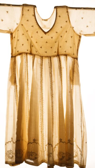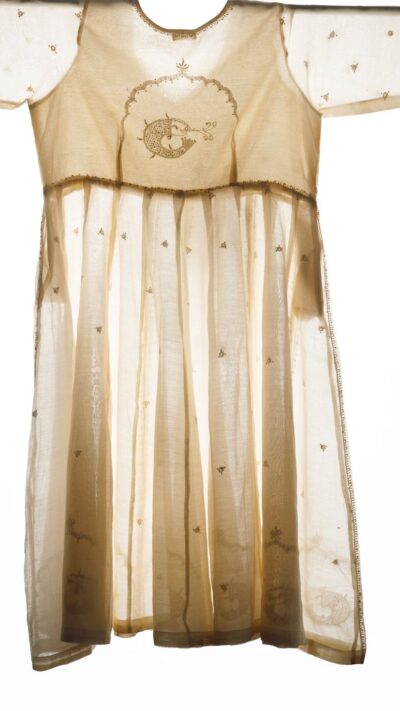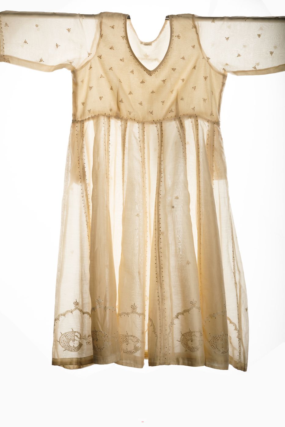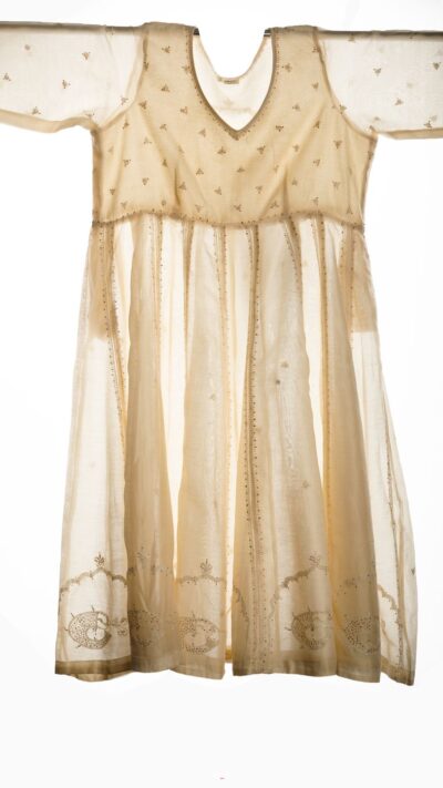 Mahi (Fish) and Mehraab (the Archway) are the unique leitmotifs of Awadh’s history over ages. Both symbols represent cultural legacy & auspicious symbolism associated with the grandeur of Awadh courts since the Golden Age of Saket aka Ayodhya. We have merged them in this stellar dress created using very fine embroidery techniques