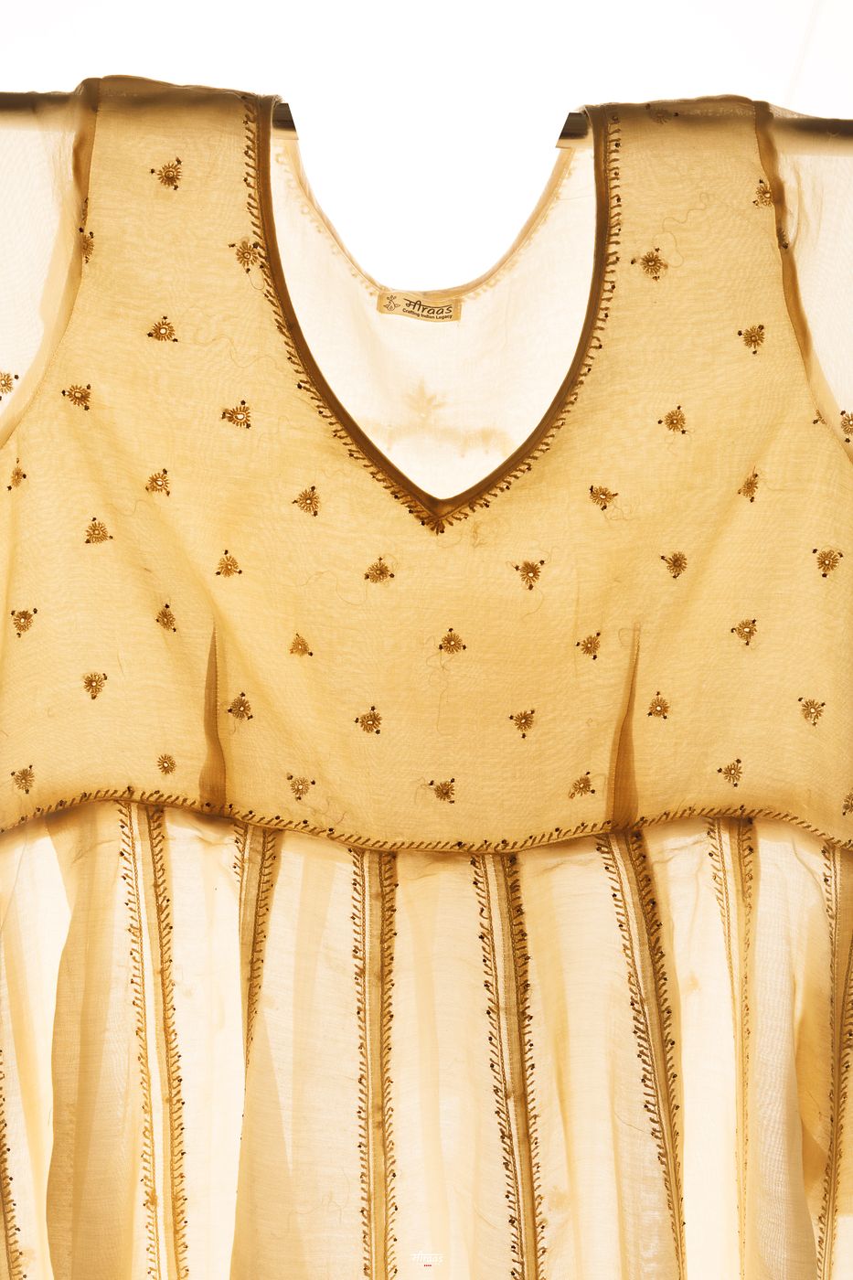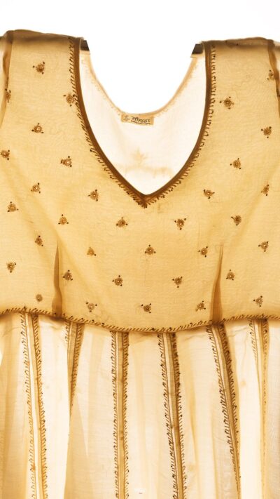 Antiquity of the Golden era Chikankari gets a revival with this Resham Chikankari Kalidar dress, with very fine Murri stitch detailing on each kali panel, and Mahi Mehraab moodboard, making it an outstanding museum quality piece.