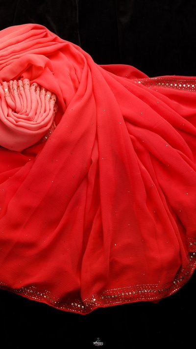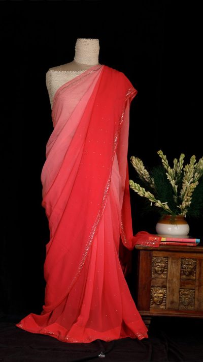 POSHAAK (about the saree): Hand Embroidered meticulously on luscious Pure Silk Chiffon, this Rose coloured Pink Ombre dyed Mukaish saree is made with Daana Mukaish, scattered all through the floaty fabric.