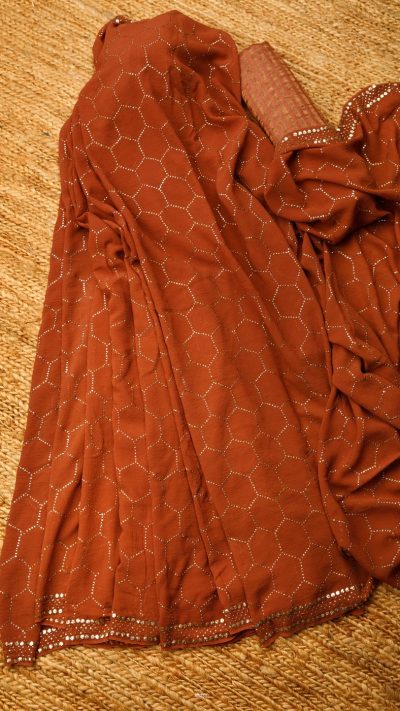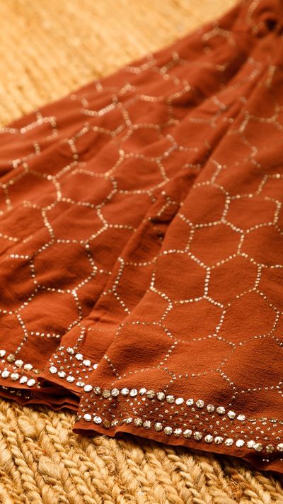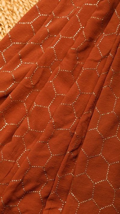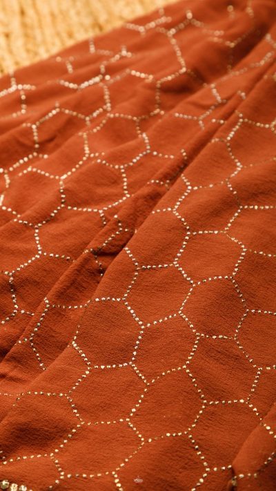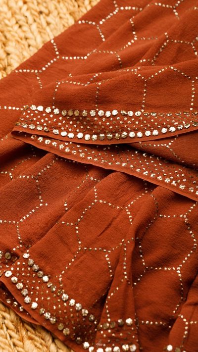 POSHAAK (about the saree): Hand Embroidered meticulously on luscious Pure Georgette Silk, this honey chocolate coloured Mukaish saree is made with Daana Mukaish, following the Honeycomb pattern all through. The border of the saree is done with a six line border, featuring Daana & Teeki mukaish. For our Mukaish sarees, we mostly Daana Mukaish, for its subtle, regal charm and comfort for the wearer for a longer period of time. It is an Heirloom Collectible for any connoiseur.
