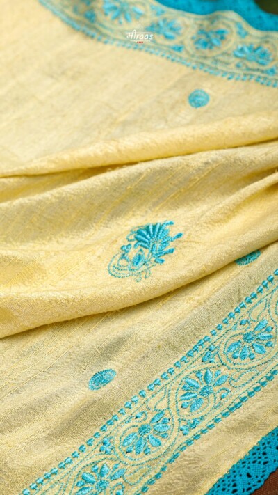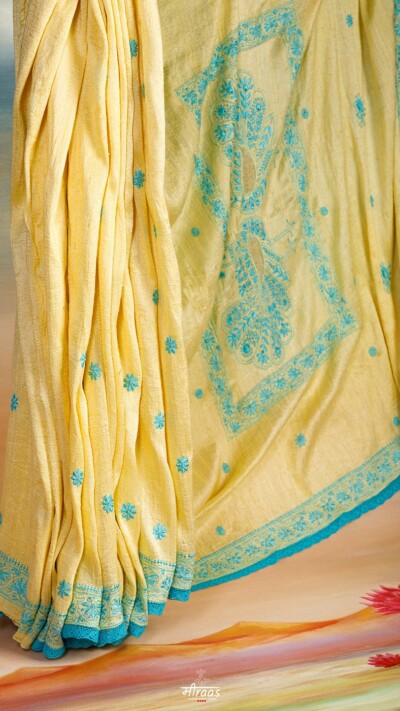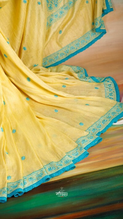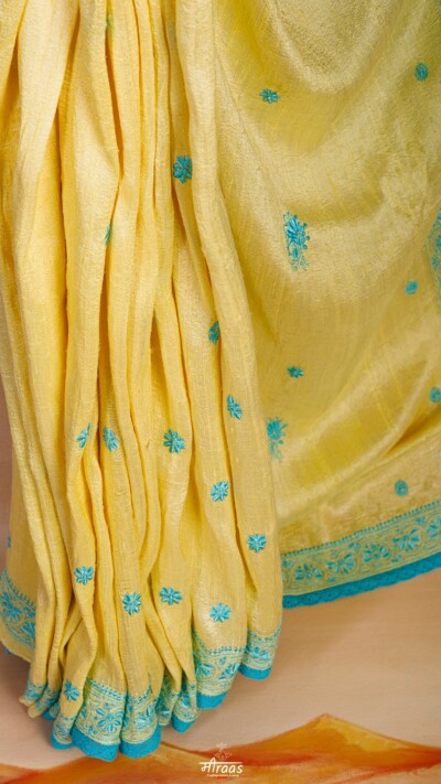 This handloom Mulberry Silk saree has a buttery yellow hue, that is accentuated with Firozi Resham Chikankari embroidery to bring out the colour on colour interplay of the craft, that is usually known for monotone look.