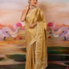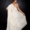 This delicate & regal fawn coloured Chikankari saree has embroidered with motifs of Mrigya – a doe eyed Mrignayani & Mrig. They adorn the saree palla, along with the antique Crown boota (250 years plus old) scattered on the body, cut with Kasab Jaali work.