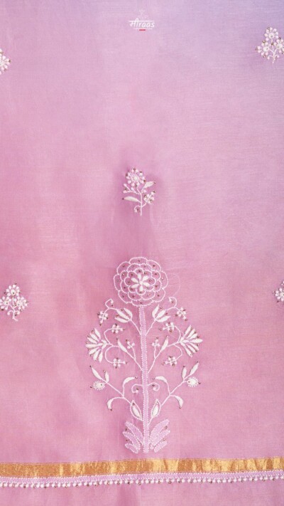 The embroidery is further enhanced with stars of Mukaish. Stitches like Orma, Ghaspatti, Shadow, Zanjeera, Rahet, etc have been used to bring alive the motifs. The lovely lilac colour is soothing, elegant and yet unique in its own way.