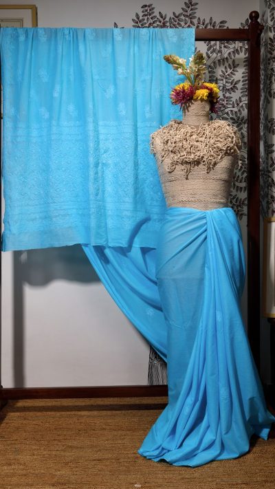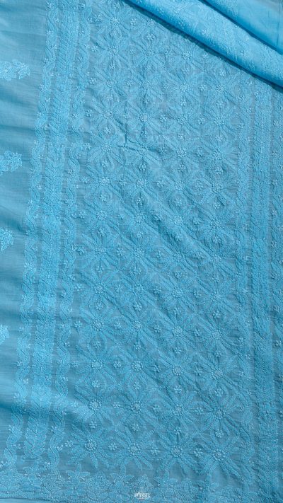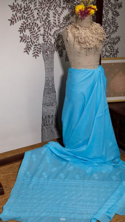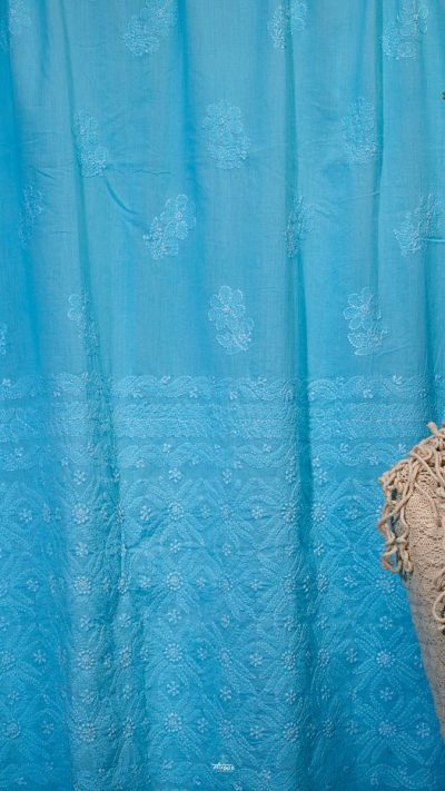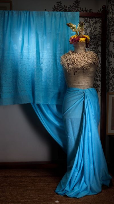 Poshaak (about the saree): This lovely Bakhiya (shadow) Phanda (French knot) embroidery fresh Blue saree has a unique border display with multiple border usage on palla and a very fine border with keel kangan stitch, running through the saree.