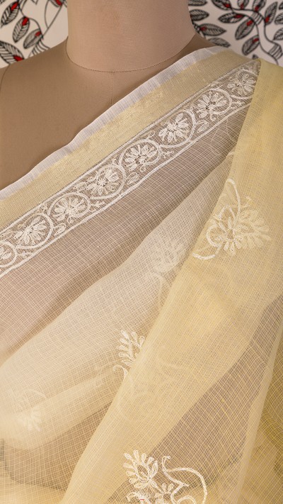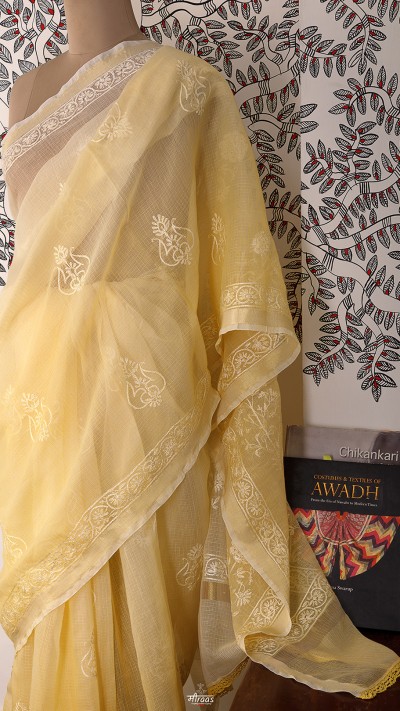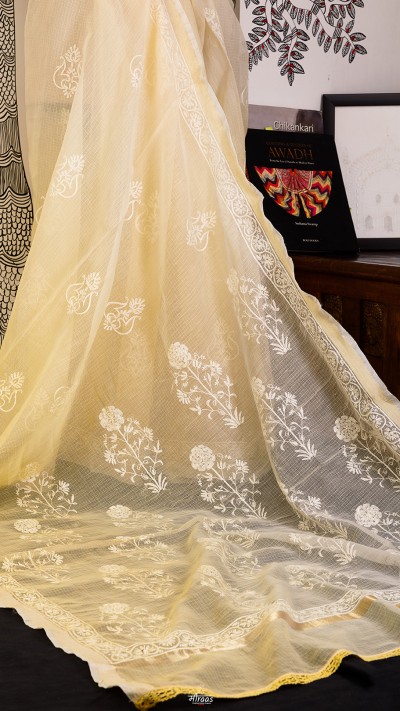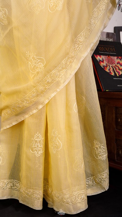 The embroidery is Tepchi Chikankari in resham thread. The soft yellow ombre shade gives it a delightful look, which is perfect for summers. The saree is one to be cherished and worn lovingly as soon as summers come calling.