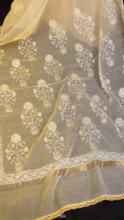 A gorgeous Chikankari Kota Doria saree with our signature Floral motif of Patta Patta Boota Boota, in soft Ombre shades of Yellow to evoke fragrant Sandalwood memories of summer. This saree is one piece only and Ready To Ship.