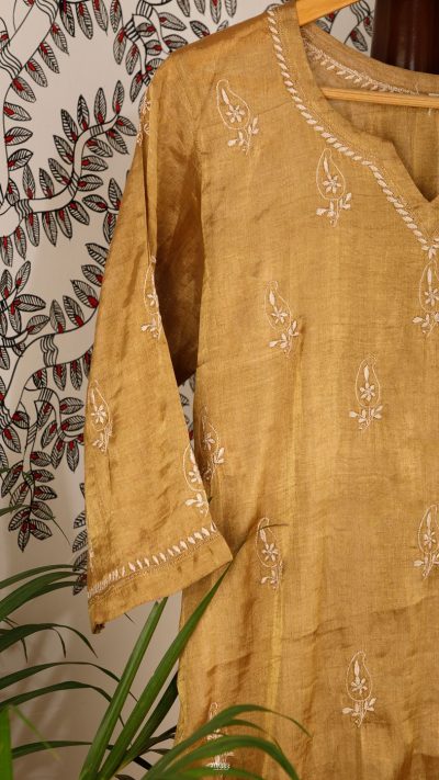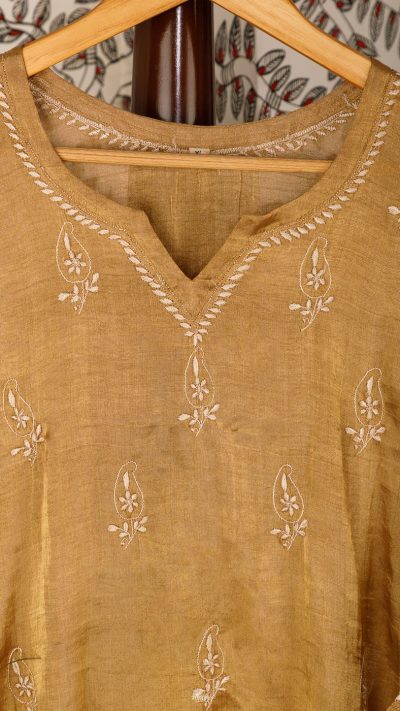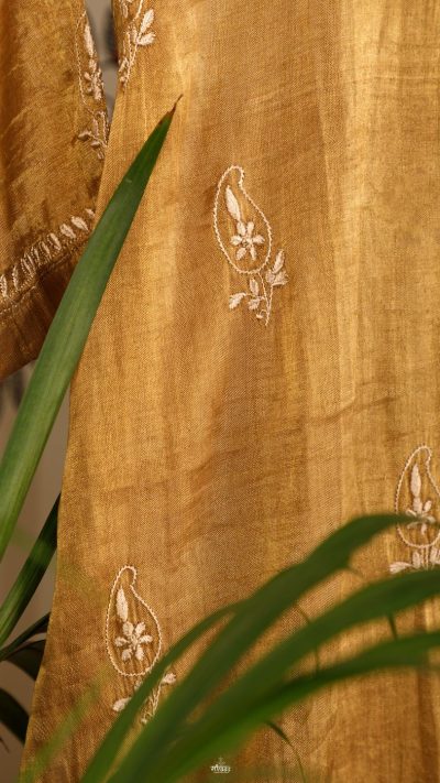 Swarna Ambi or the Golden Mango is an ode to the Fruit of Awadh. The front panel & sleeves of the kurta are heavily designed with miniature Paisley Motif, and the back has a stunning Floral motif with very rare stitches of Bijli & Murri.