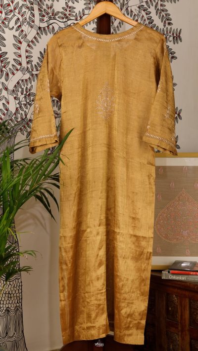 Swarna, or the one that is Gold! This Gold Zari Silk Kurta from Meiraas, is anointed with delicate Resham Chikankari in Gold hue, with the Fruit of Awadh – Ambi.