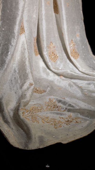 Each peacock motif is highlighted with Qasab Taar Aari embroidery detailing, done very painstakingly. Thereafter, the saree is scattered with high quality micro sequins all over. Cutdana and Pearls add their lustre to this masterpiece of a saree!