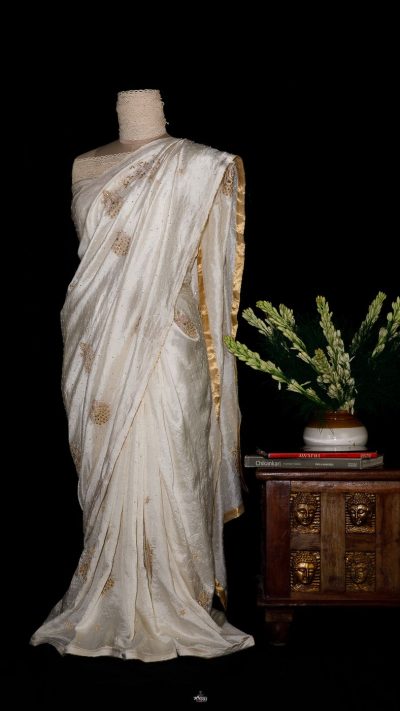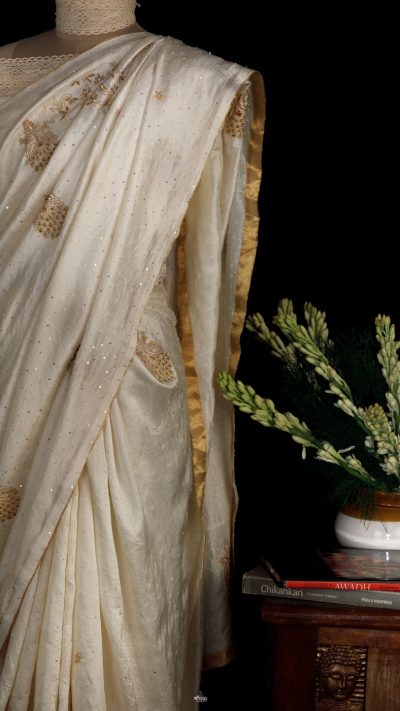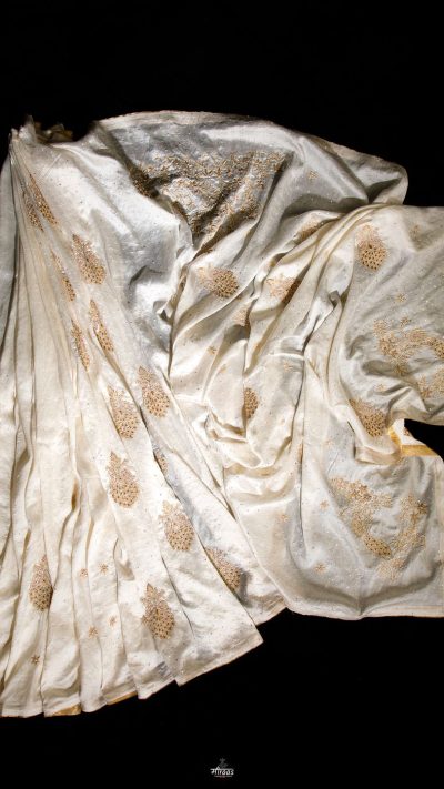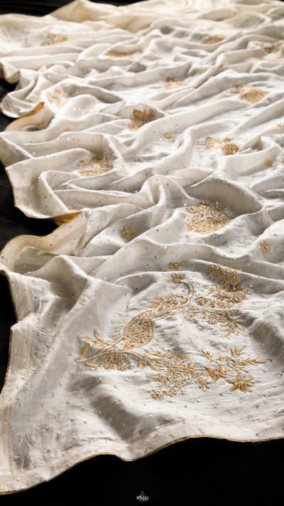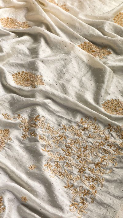 Three Heritage hand embroideries of Awadh – Resham Chikankari, Qasab Taar Aari and Zardozi, come together on this poetry of a saree, Swarna Mayur.