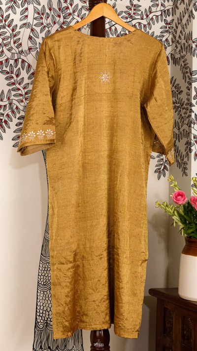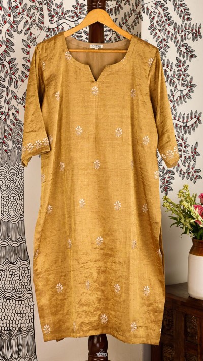 Swarna tunic, on the other hand, is made in Handloom Gold Zari Silk, with Resham Chikankari floral booti scattered in minimalist design mood board, as that is all this fabric needs to dress up. We wanted to create a more functional Kurti for the festive & wedding seasons, where one is running between events, & wants elegance and opulence, ready at their fingertips.