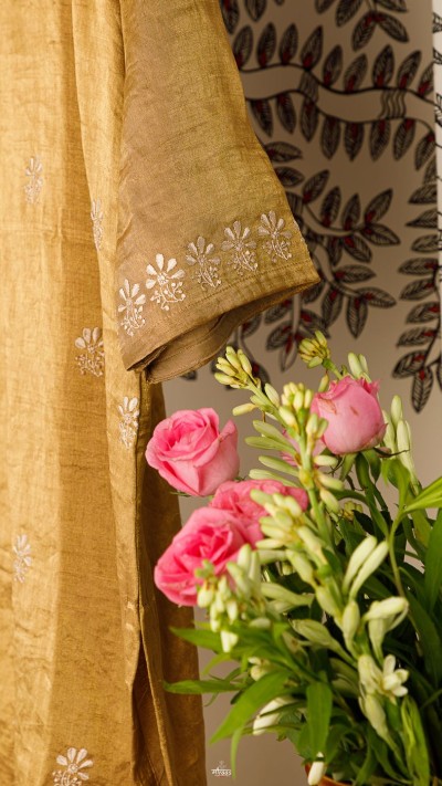 Swarna is a hue we love! We introduced the fabric of Zari Silk (or Tissue) with Resham Chikankari, back in 2020, with our Dhanlakshmi collection. Since then, this is one of our most revered & loved creations.