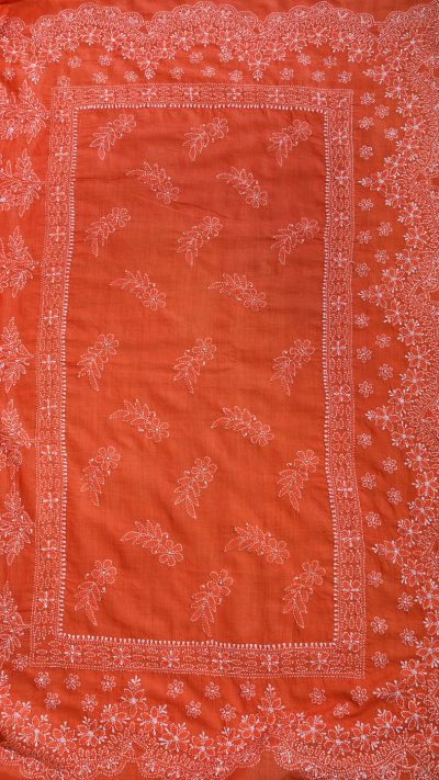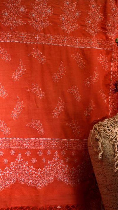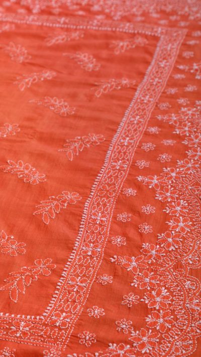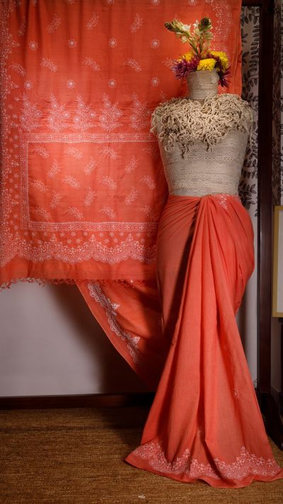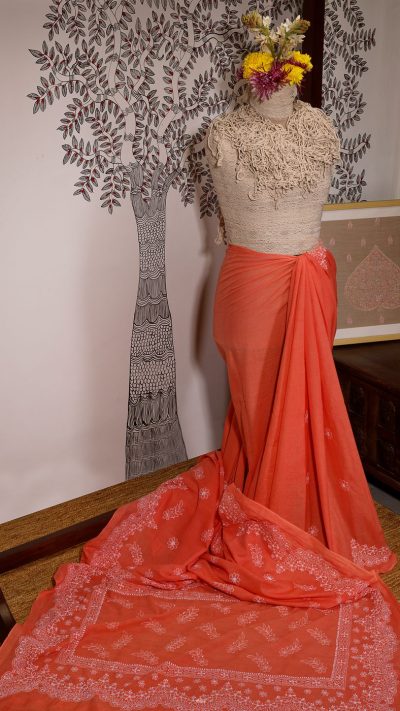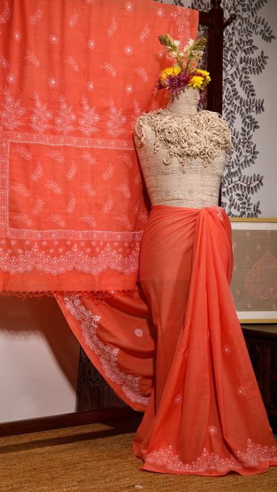 Poshaak (about the saree): This lovely Bakhiya (shadow) Phanda (French knot) embroidered Coral Orange saree has Meiraas Exclusive Scallop motif, that runs all through the border and palla of the saree. This unique motif gives a delightful toran like appearance to the design layout of the saree.