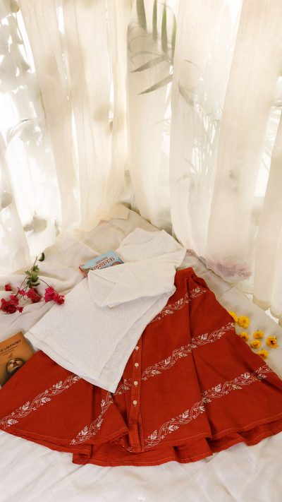 This beautiful Rust coloured Chikankari Cotton Skirt will pair very well with Falling Leaves White Top Just meant to be!