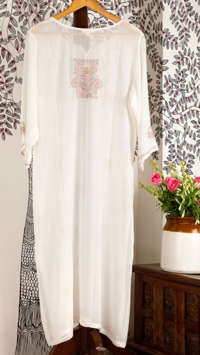 The front of the Kurta and sleeves has an open tulip floral motif with Qasab Taar ki Jaali, the back has the re-created statement motif of The Awadh Blossom, in all its grandeur, with very intricate workmanship.