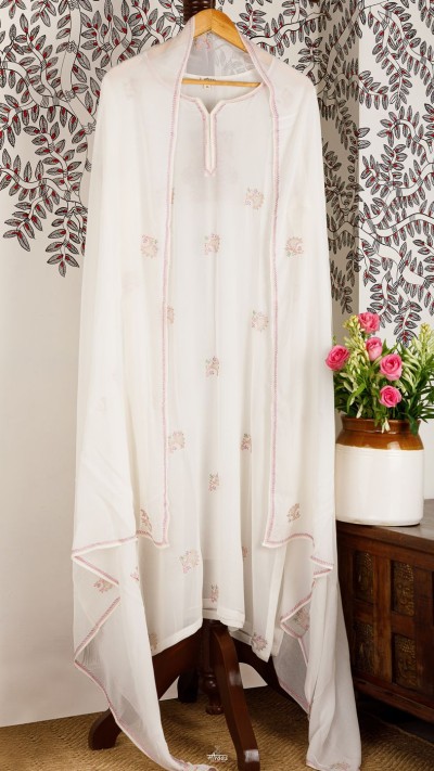 This 2 Taar Resham Chikankari Kurta Dupatta ensemble is a rarity in minimalist moodboard. Usually when it comes to 2 Taar Resham Chikankari, it is so rare, that one gets full ensemble embroidered in it. Minimalist moodboard allows patrons to enjoy this rare & precious embroidery, with a historic motif, in a more functional format.