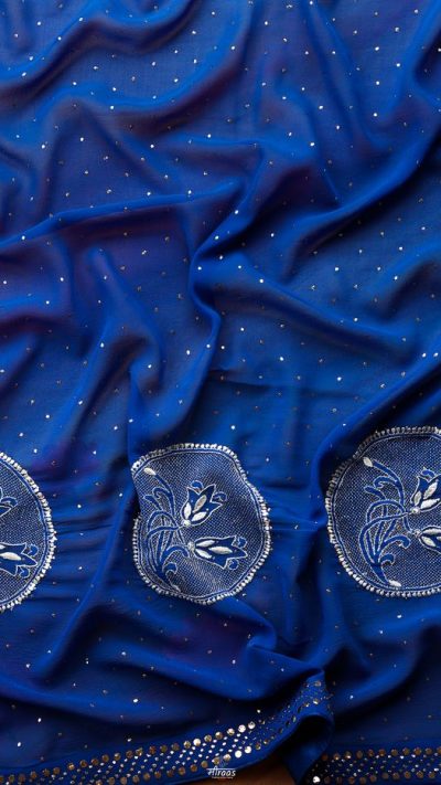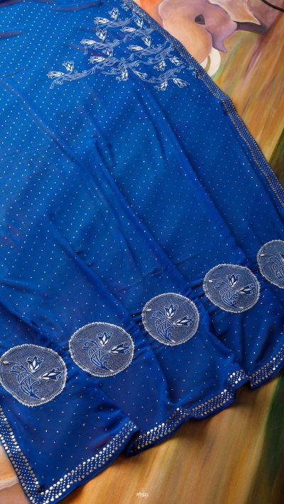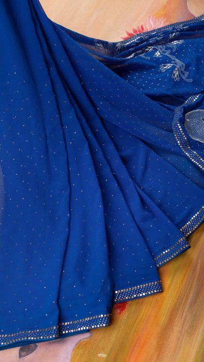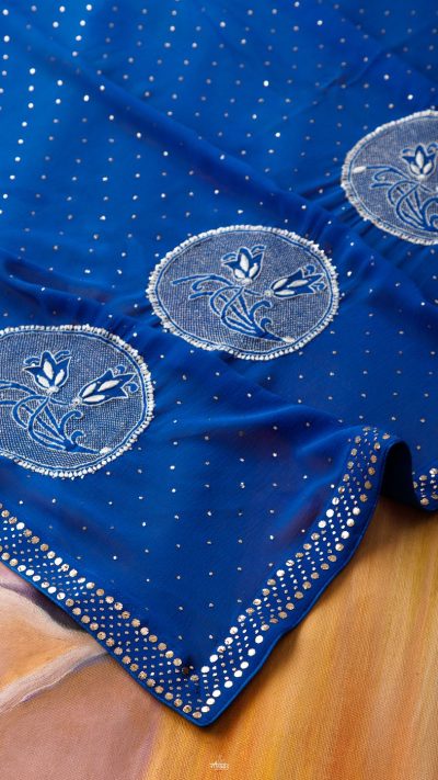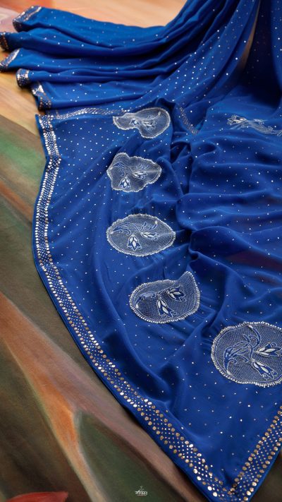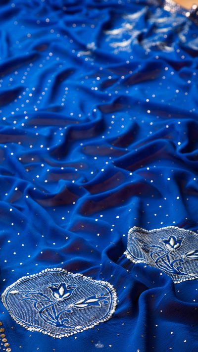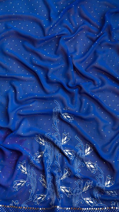 Tulip Royale, the grand & opulent Mukaish saree with one of kind Chikankari embroidery, added as a highlight, in the regal Royal Blue hue.