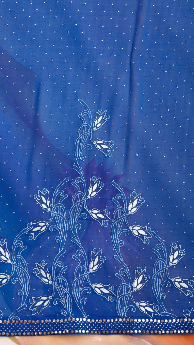 The shoulder also has a romantic web of intertwined tulips, again showing different shades of same royal blue, due to slick technique of embroidery!