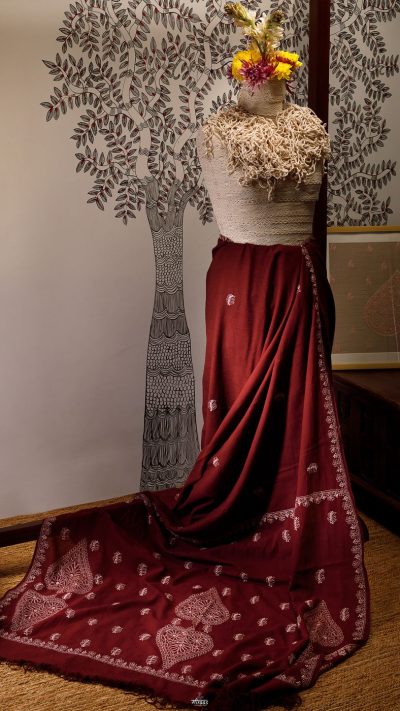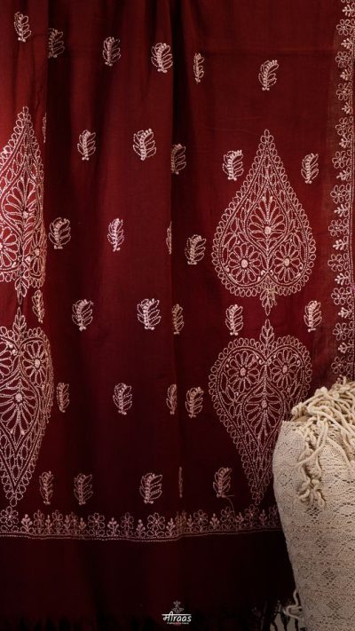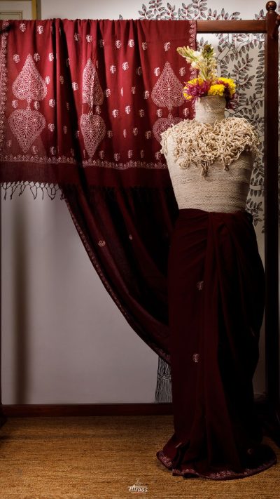 Poshaak (about the saree): Wine is a beautiful deep plum hued Chikankari saree, that needs very little to dress it up or down for various occasions.