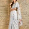 Nadi saree has the Meiraas exclusive Kabootarbaazi motif running on the palla; signifying life of flora and fauna due to the nurturing nectar that is provided by our rivers. The border is a stunning floral bel running through the saree, and the body has small floral bootis scattered all over.